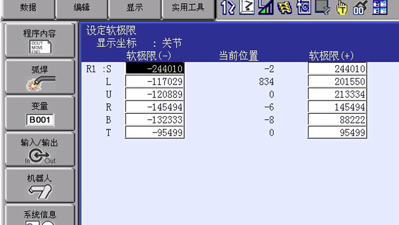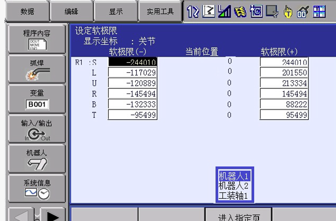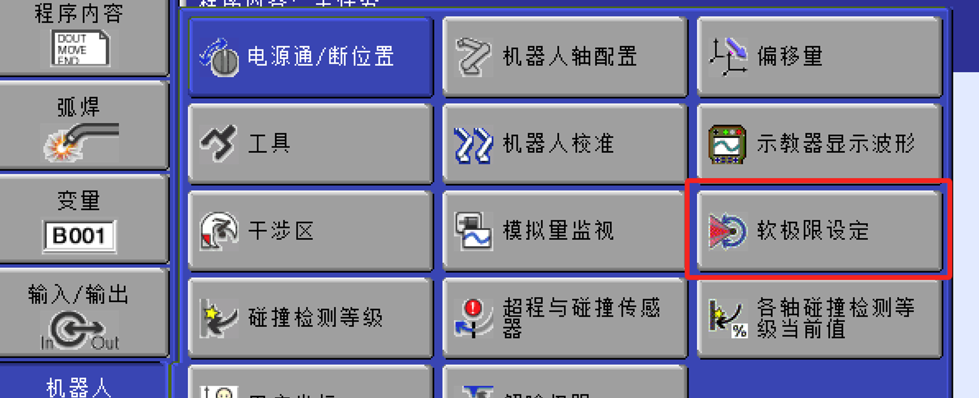 软极限设定功能是指将机器人的动作范围通过软件进行设定的功能,区别于使用挡块来作为硬限位(为检测机器人的工作范围而机械性设定的开关,称为限位开关。)。只有在示教模式下,且系统模式是管理模式及以上模式时,才会显示软限位设定画面。